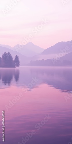 Obraz premium Misty mountains and tranquil lake at dawn under fog