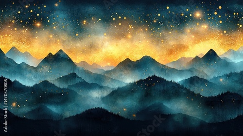 © 4575, Naklejka premium Misty mountains at sunset, illuminated by countless glowing lights in the sky, creating a magical, serene atmosphere