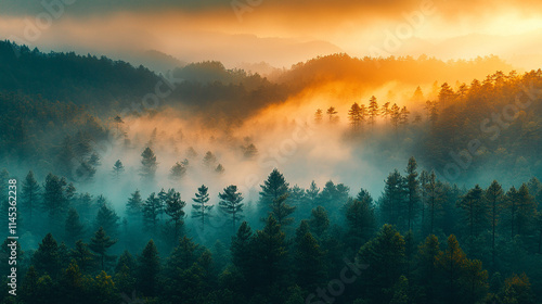 Fototapeta premium Misty mountains bathed in warm orange and yellow hues at sunset, symbolizing...