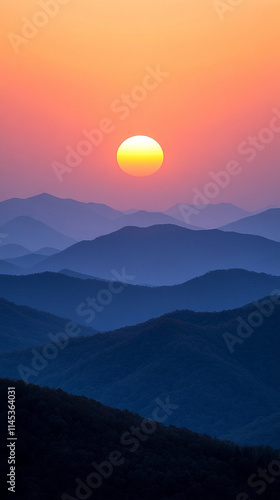 Fototapeta premium Misty mountains bathed in warm orange and yellow hues at sunset, symbolizing tranquility and the beauty of nature's chaos, a perfect high-definition phone wallpaper to evoke peace and awe