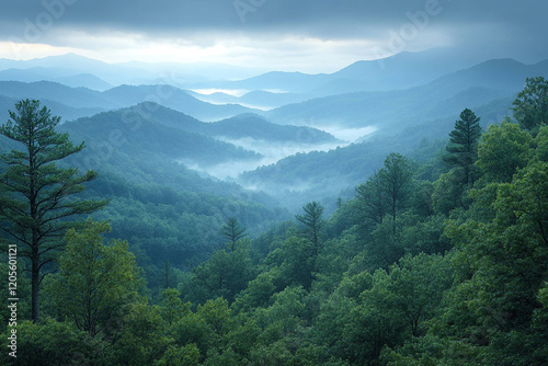 © Johanddss, Fototapeta premium Misty Mountains Blue Ridge Skyline Forest Trees