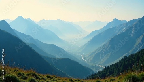Fototapeta premium Misty mountains in the background of a vast valley, , tranquility