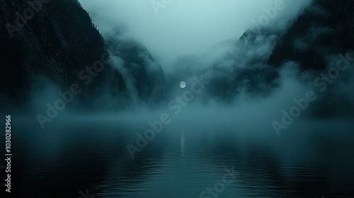 © julio, Naklejka premium Misty mountains reflect a serene moonlit lake at twilight.