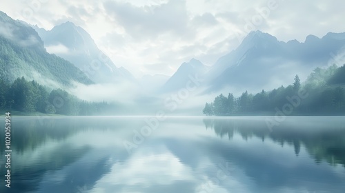 © Ali, Fototapeta premium Misty mountains reflected in a still lake.