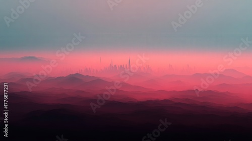 © AiHRG Design, Fototapeta premium Misty mountains stretch across the foreground while a distant city skyline emerges through a vibrant pink haze at sunset.