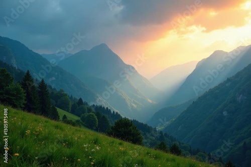© Namtip, Fototapeta premium Misty mountains with a faint rainbow after rain shower , maui, west maui, view