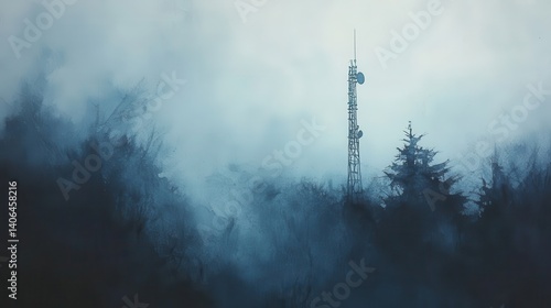 Obraz premium Misty mountaintop with communication tower.