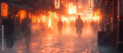 Naklejka premium Misty night street scene, figures walking past glowing lanterns and shops