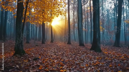 Fototapeta premium Misty November forest with fallen leaves and a soft sunrise, capturing a...