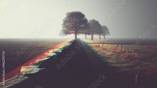 Fototapeta premium Misty Path Lined with Bare Trees and Stone Wall