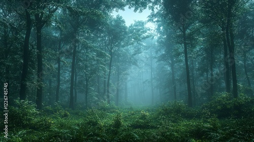 © arsyi_06, Fototapeta premium Misty path through a dark green forest.