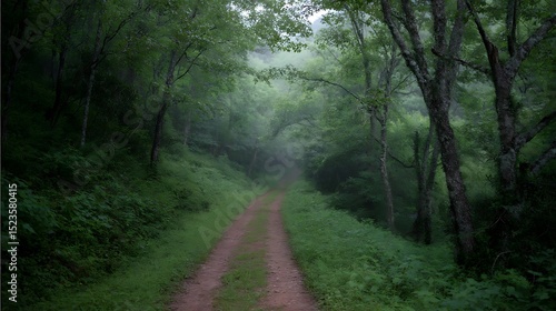 © melani, Obraz premium Misty path through a vibrant forest