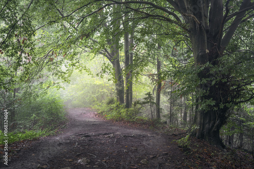 Fototapeta premium Misty Path Through Lush Carpathian Forest in Poland