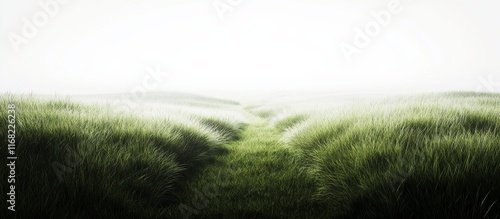 Naklejka premium Misty Path Through Lush Green Grass Field.