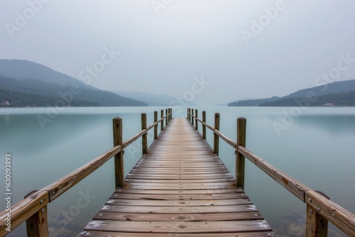 © phurinee, Naklejka premium Misty Pier Extending Into Tranquil Lake Surrounded by Mountains