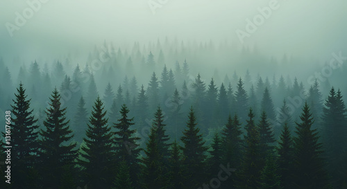© yash, Obraz premium Misty Pine Forest Landscape