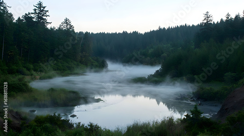 © rowiyah, Fototapeta premium Misty Pond in a Dense Forest at Dawn