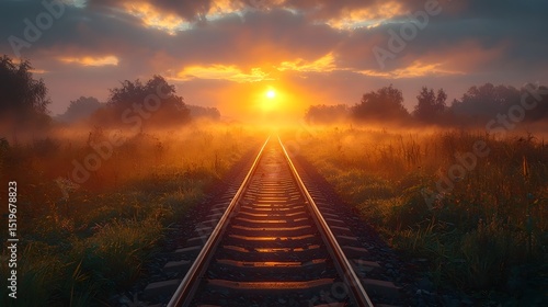 © Bussakon, Obraz premium Misty railway track leading into a golden sunrise
