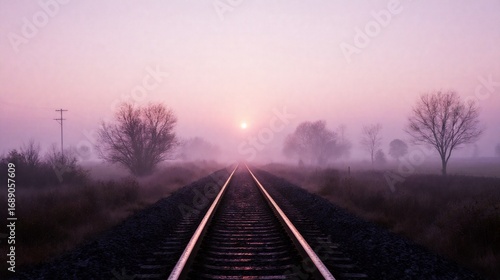 Fototapeta premium Misty railway tracks at dawn, a serene path into the foggy horizon.