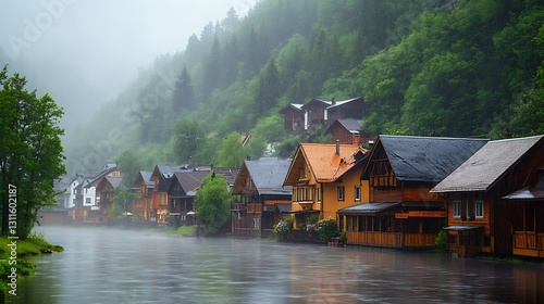 © Ardhana, Fototapeta premium Misty rain over wooden houses by river.
