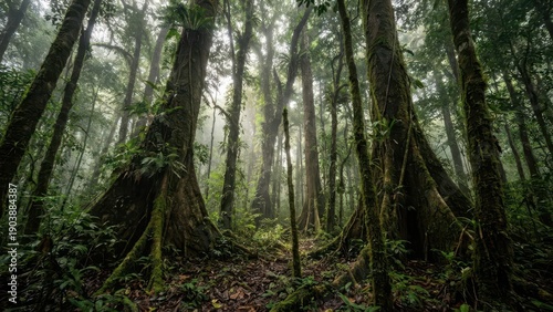 Obraz premium Misty rainforest jungle canopy with towering ancient trees and lush green foliage