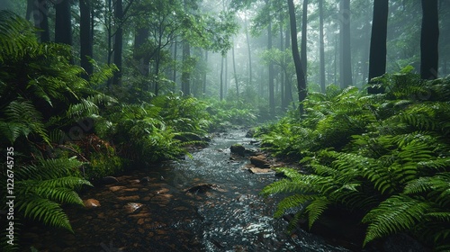 © arsyi_06, Fototapeta premium Misty rainforest stream flows through ferns.