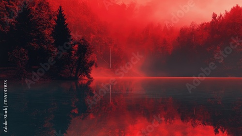 Obraz premium Misty red lake landscape with reflections and dense forest creating an eerie...