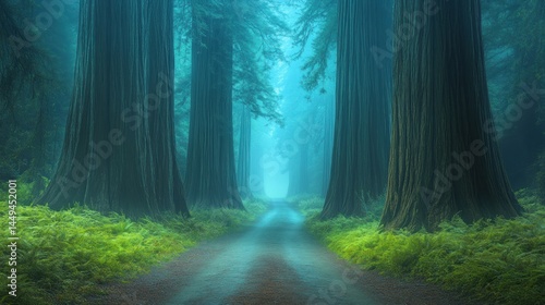 Naklejka premium Misty Redwood Forest Road