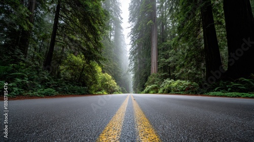 Fototapeta premium Misty redwood forest road with towering trees and yellow center line