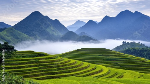 © Imam, Fototapeta premium Misty Rice Terraces and Mountains