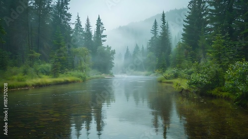 Fototapeta premium Misty river flowing through a lush green forest, reflecting trees and sky.