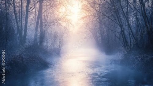 Fototapeta premium Misty river flowing through a tranquil forest.