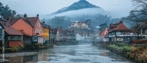 Fototapeta premium Misty river flows through quaint village nestled in valley, fog shrouds hillside