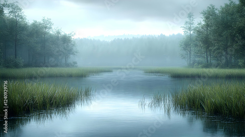 © AgungRikhi, Fototapeta premium Misty River in a Green Forest