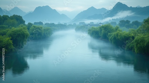 Naklejka premium Misty river, mountains, bamboo, tranquil Asian landscape