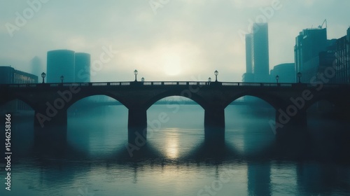 © Asraf, Naklejka premium Misty River Scene with Bridge and City Skyline at Sunrise in Soft Morning Light