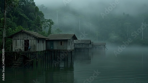 © ms25designs, Fototapeta premium Misty river scene with wooden stilt houses
