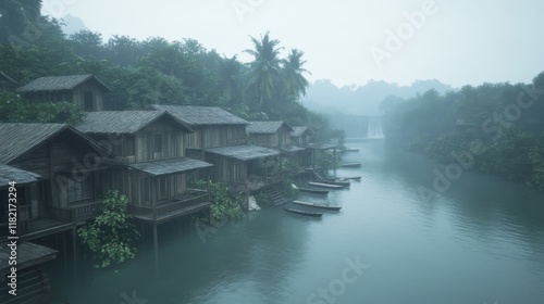 Naklejka premium Misty River Village Houses Boats Tranquil Scene