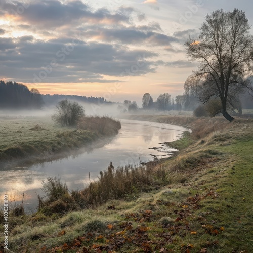 Fototapeta premium Misty river winding through a tranquil countryside landscape at sunrise