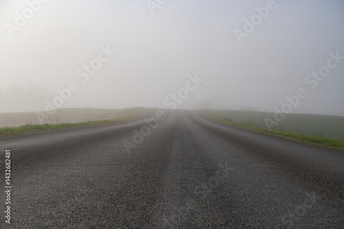 © NetPix, Fototapeta premium Misty road stretches into the distance, disappearing into a thick layer of atmospheric fog.