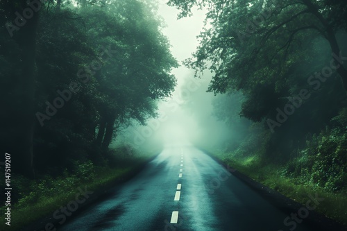 © SINTO, Fototapeta premium Misty Road Through A Dark Green Forest
