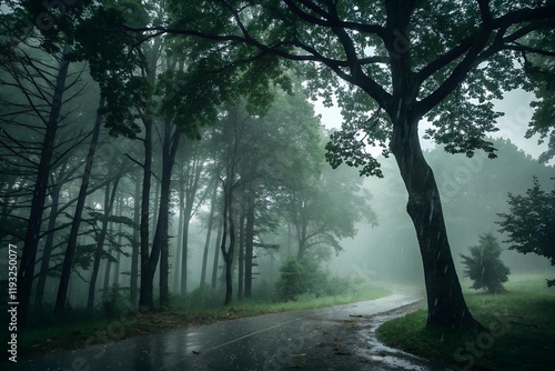 © MIkrom, Fototapeta premium Misty Road Through a Lush Forest
