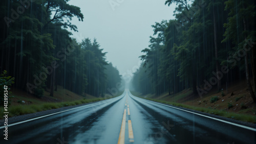 Fototapeta premium Misty Road Through Dense Forest in Rain