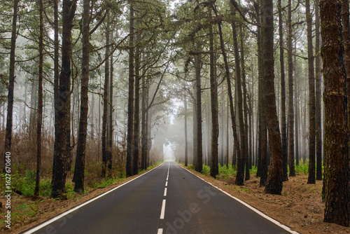 © Xalanx, Fototapeta premium Misty road through pine forest