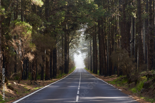 © Xalanx, Fototapeta premium Misty road through pine forest