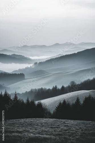 Fototapeta premium Misty rolling hills at dawn in a tranquil landscape