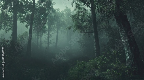 © Rahmat, Obraz premium Misty, shadowy forest scene of dense trees.