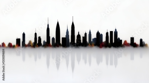 © Paisan, Naklejka premium Misty Silhouette Cityscape Skyline Autumn Leaves