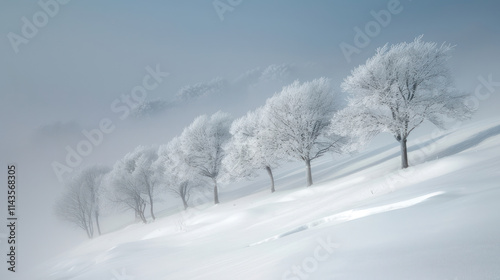 © NooPaew, Fototapeta premium Misty snow-covered forest with barely visible trees, tranquil and mysterious