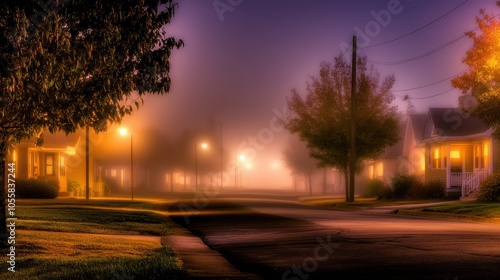 Fototapeta premium Misty suburban street at dawn with glowing streetlights